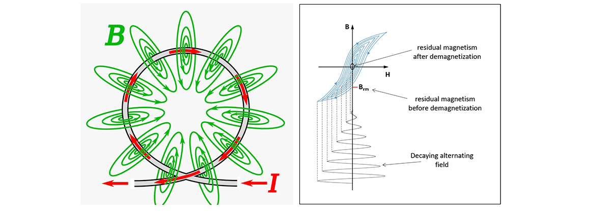 A process conducted in order to remove / reduce residual magnetism left in ferromagnetic materials following their subjection to high density magnetic fields.
