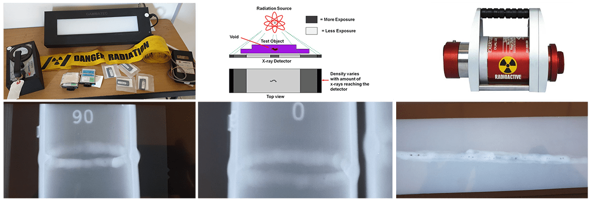 X-rays or Gamma rays are used to detect subsurface flaws. The image of the specimen is transposed onto film. Used on most materials.